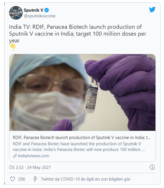 India TV News sitesinin haberine göre Rusya Doğrudan Yatırımlar Fonu (RDIF) ile Panacea Biotec firması, Hindistan'da Sputnik V üretimine başladı.