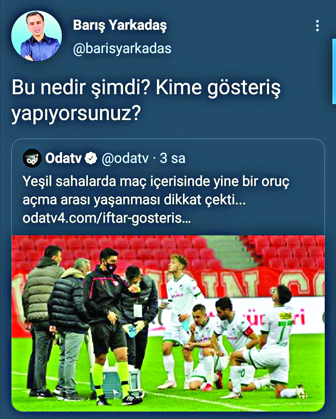 Türk milletinin bütün mukaddesatına düşmanlıkta sınır tanımadığını defalarca ispatlayan CHP zihniyeti yine şaşırtmadı. Seçim dönemlerinde takıyyenin dibine vuran ve camilerden çıkmayan yobazlar, ufukta sandık göremeyince anında aslına dönerek İslam’a ve Müslümanlara kin kusmaya başladı. Bunun en son örneği ise oruç açan futbolcuları hazmedemeyen CHP’li Barış Yarkadaş oldu. Mütedeyyin futbolcuların oruç açmasından rahatsız olan CHP’li Yarkadaş, sosyal medyada hesabından skandal bir paylaşıma imza attı. Samsunspor ile Bursaspor arasında oynanan maçta iki takım futbolcularının iftar saatinde oruçlarını açmasını hazmedemeyen Yarkadaş, "Bu nedir şimdi? Kime gösteriş yapıyorsunuz?" ifadeleriyle sporcuları hedef aldı.