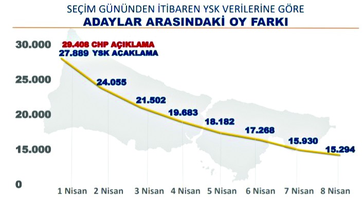 Kendisiyle Binali Yıldırım arasındaki oy farkının 29 bin 408 olduğunu beyan eden Ekrem İmamoğlu’nun yalanını açılan sandıklar yüzüne vurdu. AK Parti’nin milli iradeye sahip çıkma gayreti sonrası ifşa olan usulsüzlüklerin yeniden değerlendirilmesi neticesinde aradaki oy farkı hızla eridi. Seçim akşamından beri gün gün eriyen fark dün itibariyle 14 bin 532’ye kadar indi.