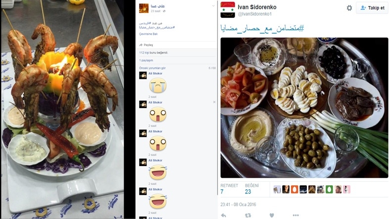 ‘Madaya kuşatması için dayanışma’ anlamına gelen Arapça etiketle yapılan bazı paylaşımlarda rejim ve Hizbullah yanlıları yemek fotoğrafları kullandı.