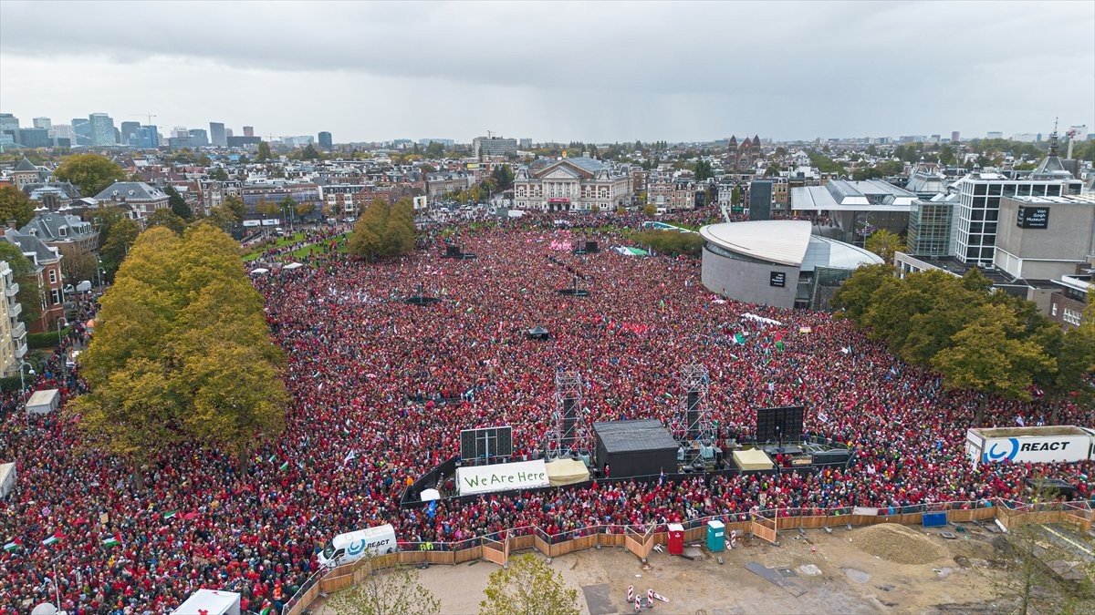 Amsterdam’da yaklaşık 250 bin kişi, hükümetin İsrail yanlısı tutumuna karşı “Kırmızı Çizgi” sloganıyla meydanları doldurdu. Eyleme yüzü aşkın sivil toplum kuruluşu destek verdi.