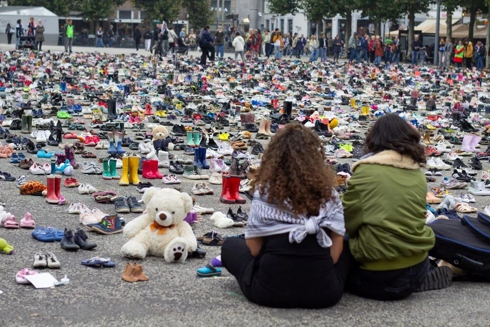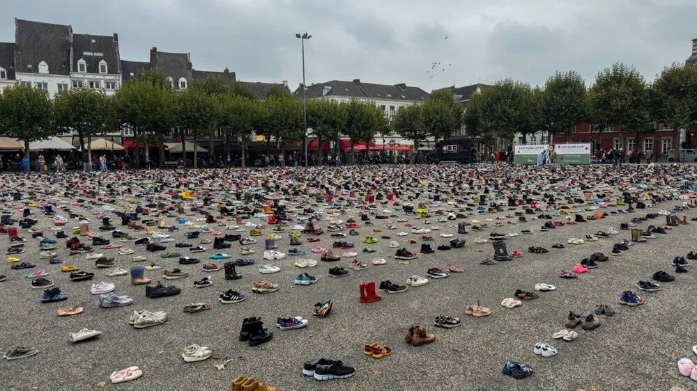 Hollanda'nın Maastricht kentinde, Gazze'de İsrail'in saldırılarında hayatını kaybeden binlerce Filistinli çocuk ile gazeteciler için anma töreni düzenlendi. Binlerce çocuk ayakkabısı meydana bırakılırken, hayatını kaybedenlerin adları ve yaşları tek tek okundu.