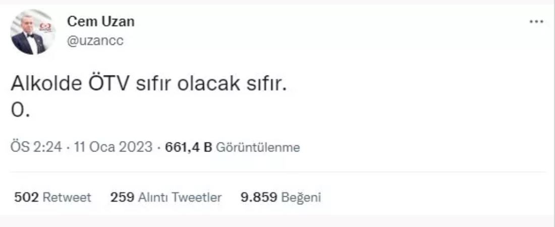 Kemal Kılıçdaroğlu'nun ardından hakkında kesinleşmiş 47 yılı aşan hapis cezası bulunan ve 2023 seçimlerinde aday olacağı iddia edilen firari Cem Uzan da sosyal medya hesabından bir paylaşım yaparak alkol vaadinde bulundu. Alkole indirim vaadiyle oy almaya çalışan Cem Uzan, "Alkolde ÖTV sıfır olacak sıfır." dedi.