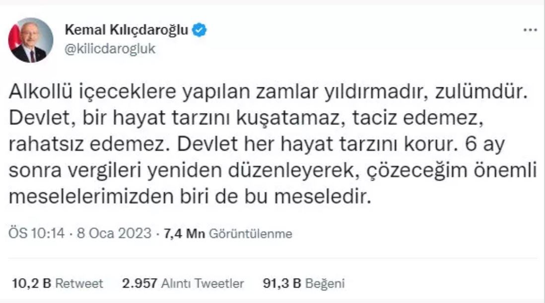 Alkol vaadiyle oy almaya çalışan Kılıçdaroğlu paylaşımında, "Alkollü içeceklere yapılan zamlar yıldırmadır, zulümdür. Devlet, bir hayat tarzını kuşatamaz, taciz edemez, rahatsız edemez. Devlet her hayat tarzını korur. 6 ay sonra vergileri yeniden düzenleyerek, çözeceğim önemli meselelerimizden biri de bu meseledir" ifadelerini kullandı.