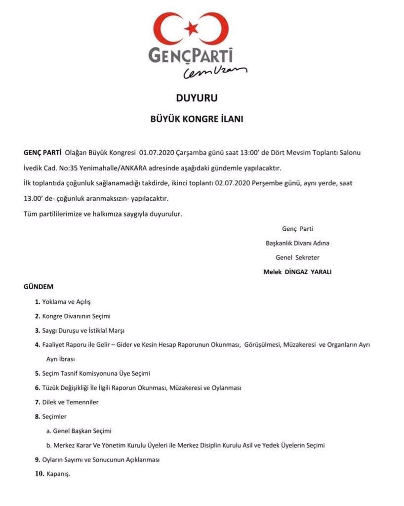 Bir dönem hortumcu Cem Uzan’ın Genel Başkanlığını yaptığı Genç Parti, Ankara'da 1 Temmuz Çarşamba günü Olağan Büyük Kongresini yapacak.
