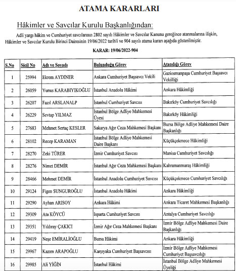 Resmi Gazete'de yer alan Hakimler ve Savcılar Kuruluna ait atama kararına göre, 5 bin 75 adli yargı hakim ve cumhuriyet savcısı ile 351 idari yargı hakim ve savcısının ataması, 19 Haziran tarihli atama kararı ile gerçekleştirildi. Söz konusu atamalar, 2802 sayılı Hakimler ve Savcılar Kanunu gereğince yapıldı.