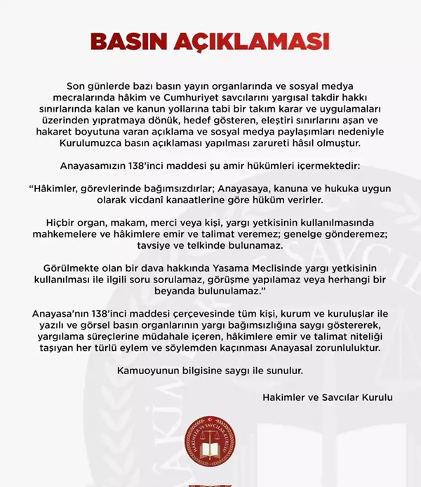 "Son günlerde bazı basın yayın organlarında ve sosyal medya mecralarında hâkim ve Cumhuriyet savcılarını yargısal takdir hakkı sınırlarında kalan ve kanun yollarına tabi bir takım karar ve uygulamaları üzerinden yıpratmaya dönük, hedef gösteren, eleştiri sınırlarını aşan ve hakaret boyutuna varan açıklama ve sosyal medya paylaşımları nedeniyle Kurulumuzca basın açıklaması yapılması zarureti hâsıl olmuştur.
