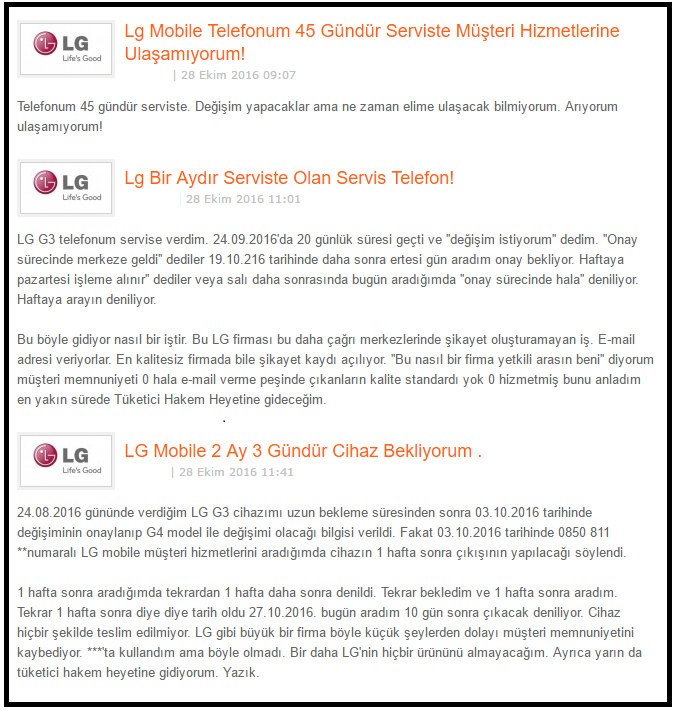 Ayrıca şikayet sitelerine girip arama yaptığımızda, konuyla alakalı birçok şikayetin olduğunu ve mağdurların aylarca telefonunu teknik servisten alamadığını, karşılarında da bir muhatap bulamadıklarını görüyoruz.