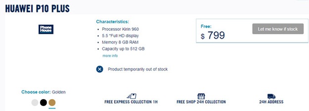 799 Dolar fiyat etiketi ile listelenen telefon, gümüş, altın ve siyah renk yapılandırmalarıyla sunuluyor. Beklendiği gibi telefon 'geçici olarak stokta yok' ancak Huawei'nin 26 Şubat tarihinde düzenleyeceği etkinlikten sonra satışta olacak.