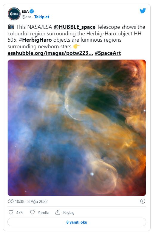 NASA, Twitter’dan yaptığı paylaşımla Hubble Uzay Teleskobu’nun yakaladığı yeni bir görüntüyü paylaştı. Teleskobun, yakaladığı HH 505 adlı yeni bulut, Orion takım yıldızının içindeki Herbig-Harbo nesnesini çevreliyor. Renkleriyle insanların ilgisini çeken bu görsel, gök bilimciler tarafından yakalandı. Orion’daki bu bulutsu, Dünya’ya en yakın aktif yıldız oluşum bölgelerinden biri olan Orion Bulutsusu’nun bir bölümünü gösteriyor.