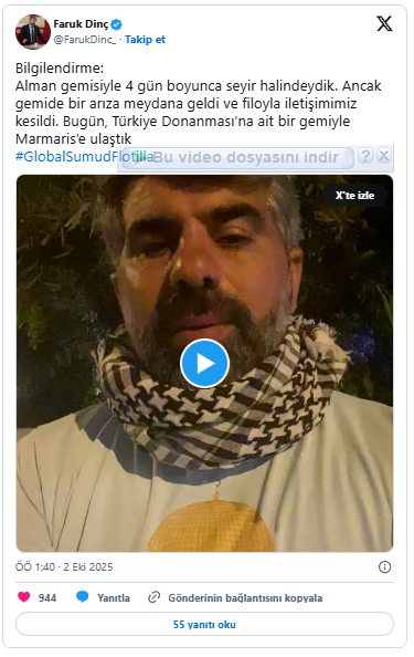 Konuyla ilgili sosyal medya hesabından açıklama yapan Dinç, “Bilgilendirme: Alman gemisiyle 4 gün boyunca seyir halindeydik. Ancak gemide bir arıza meydana geldi ve filoyla iletişimimiz kesildi. Bugün, Türkiye Donanması’na ait bir gemiyle Marmaris’e ulaştık” ifadelerini kullandı.