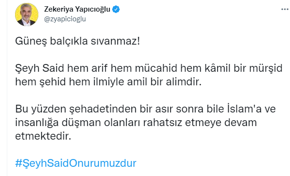 Twitter hesabından paylaştığı mesajına, "Güneş balçıkla sıvanmaz!" diyerek başlayan Yapıcıoğlu, "Şeyh Said hem arif hem mücahid hem kâmil bir mürşid hem şehid hem ilmiyle amil bir alimdir." ifadelerini kullandı.