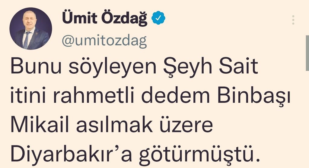 Zafer Partisi Genel Başkanı ırkçı Ümit Özdağ'ın Şeyh Said'e yönelik haddi aşan hakaretine bir tepki de HÜDA PAR Genel Başkanı Zekeriya Yapıcıoğlu'ndan geldi. Yapıcıoğlu, "Şeyh Said onurumuzdur." dedi.