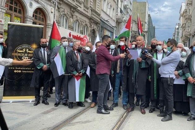 Dünyanın birçok şehrinde İsrail’in Filistin’e yaptığı zulmü protestolar sürüyor. İstanbul 2 Nolu Barosu ve Hukukçular Derneği üyeleri de bu zulme sessiz kalmayarak, Beyoğlu’nda basın açıklaması yaptı. Dernek Başkanı Ahmet Yılmaz, “Müslümanların ilk kıblesi olan Mescid-i Aksa, Kudüs ve Filistin toprakları 1948 yılından beri İsrail terör devletinin işgali altındadır. Her Ramazan ayında olduğu gibi bu yıl da Ramazan ayının başlangıcında İsrail terör devleti, Filistin halkına saldırmaktan geri durmamıştır. Nitekim Ramazan ayının son cuması olan 7 Mayıs günü Mescid-i Aksa’da namaz kılmak üzere toplanan sivillere orantısız güç kullanarak saldırmıştır. İsrail terör devleti saldırılarına Gazze’de devam etmiş ve bu saldırılarda 41’i çocuk ve 23’ü kadın olmak üzere 145 sivil Filistinli şehit olmuş, bin 100 kişi ise yaralanmıştır” dedi.