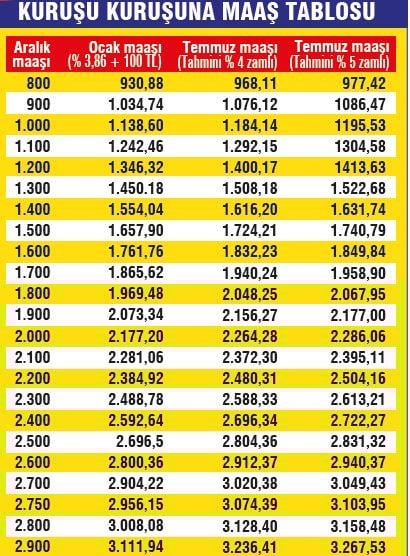 Enflasyon eğer yüzde 5 çıkarsa, SSK ve Bağ-Kur emeklilerinin eline geçen para Temmuz'da 43 lira ile 190 lira arasında artacak. Emekliler, bu yıl yapılan 3 zamla ise 172 ile 428 lira arasında gelir artışı elde etmiş olacak. Takvim'in haberine göre, Aralık'ta en düşük emekli aylığı (Bağ-Kur tarım) emekli aylığı 745 lira 42 kuruş idi. Ocak'ta yapılan yüzde 3.86 +100 lira zam ile 874 lira 19 kuruşa ulaşan bu maaş, Temmuz artışı yüzde 5 olursa da 917 lira 89 kuruşa yükselecek. Böylece en düşük maaşta Temmuz zammıyla 43 lira 70 kuruş artış olacak.