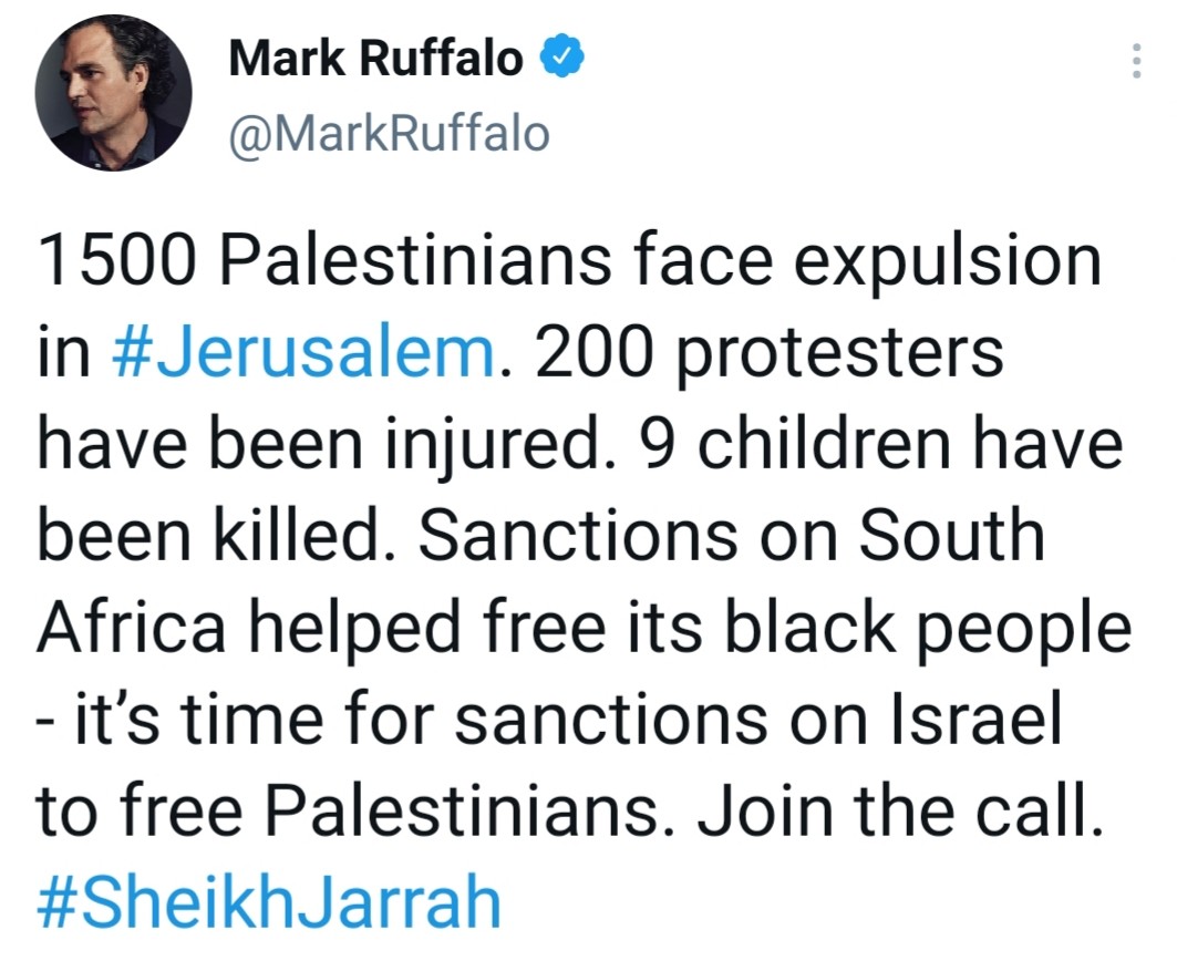 Sinemalarda Hulk karakterini oynayan Amerikalı oyuncu Mark Ruffalo sosyal medya hesabından attığı mesajda; "İsrail'e yaptırım uygulanmalı" dedi.