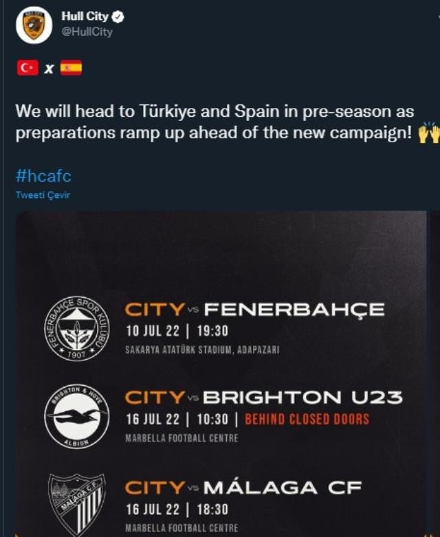 İngiltere Championship takımlarından Acun Ilıcalı'nın sahibi olduğu Hull City, 10 Temmuz'da Fenerbahçe ile Sakarya Atatürk Stadyumu'nda hazırlık maçı oynayacağını duyurdu.