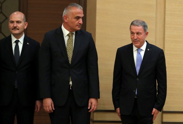 Cumhurbaşkanı Erdoğan, Hulusi Akar'ın Milli Savunma Bakanı olduğunu anons etti. Basın mensuplarının karışına çıkmak için diğer bakanların yanına geçen Akar hazır ol'a geçerek bekledi. 64 yaşındaki Akar'ın askerlik hayatı boyunca yaptığı bu hareketi burada da tekrarlaması Reuters objektiflerine yansıdı.