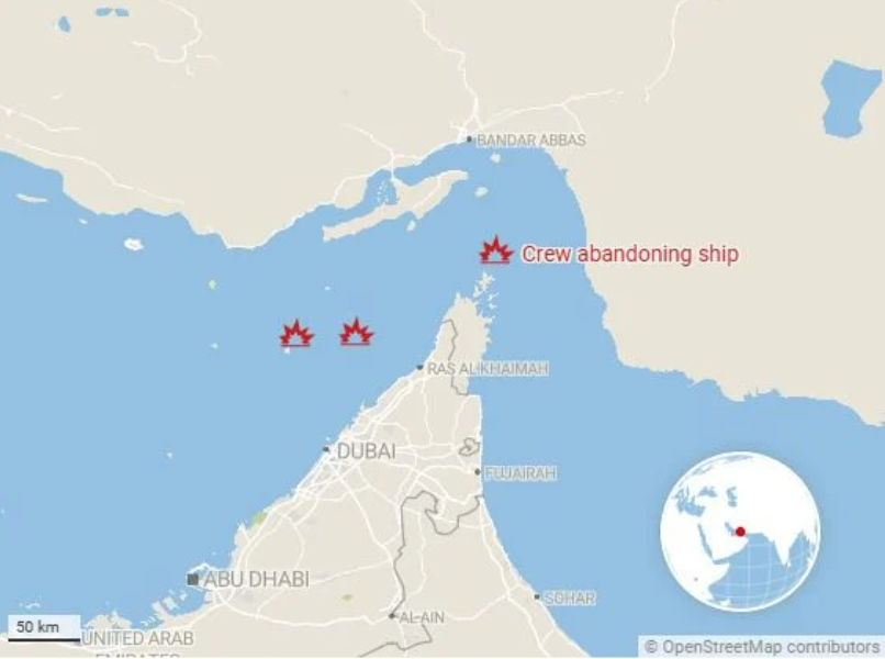 - İkinci vuruş Dubai yakınlarında: İlk saldırıdan kısa süre sonra, Dubai’nin 50 mil kuzeybatısında bir başka gemi daha İran füzelerinin hedefi oldu.