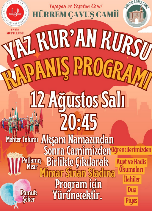 Programda Kur’an-ı Kerim tilavetleri, ilahiler, şiirler ve kısa tiyatro gösterileri yer alacak. Ayrıca öğrencilerin yıl boyunca yaptıkları çalışmaların sunumları, veliler için özel olarak hazırlanan sürpriz bölümler ve kurs eğitmenlerinin konuşmaları da programda yer alacak. Kapanış töreninde, kurs boyunca başarılı olan öğrencilere çeşitli ödüller ve başarı belgeleri takdim edilecek. Böylece öğrencilerin gayretleri taçlandırılırken, diğer katılımcılara da örnek olması amaçlanıyor. Bu anlamlı ve coşkulu kapanış için İstanbulluları davet eden Hürrem Çavuş Camii İmam Hatibi Metin Kaçar, “Bu kurs sadece bir eğitim faaliyeti değil, aynı zamanda çocuklarımızın manevi gelişimleri için çok önemli bir fırsat. Velilerimizi hem öğrencilerimizi tebrik etmek hem de bu manevi atmosferi paylaşmak üzere programımıza bekliyoruz” açıklamasında bulundu.