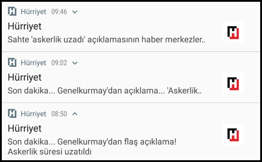 Hürriyet ise kendi ortaya attığı iddiayı yine kendisi yalanladı. Mobil uygulaması tarafından gönderilen bildirimlerde Hürriyet’in biribirini yalanlayan 3 haberi üst üste sıralandı. Böylece Hürriyet kısa bir süre içerisinde kendi kendisi yalanlayabilen bir gazete olarak tarihe geçti.