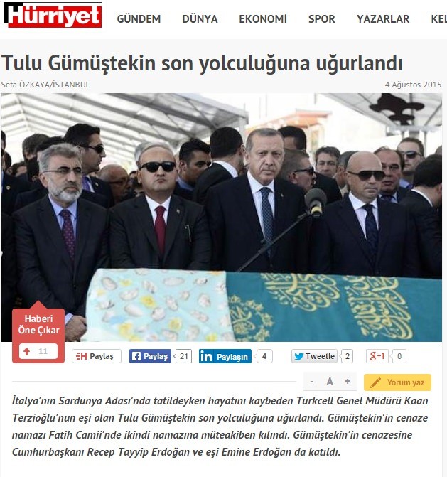 Cenaze töreninde katılan çok sayıda önemli isme haberinde yer veren Hürriyet, Süleyman Soylu'nun adını ise es geçti. Cenaze töreninden çok sayıda fotoğraf da kullanan Hürriyet, Soylu'nun bulunduğu hiç bir kareye de yer vermedi. Soylu ile Doğan Grubu arasında karşılıklı sert açıklamalar mahkemeye taşınmış ve taraflar yargı önünde hesaplaşma yoluna gitmişlerdi.