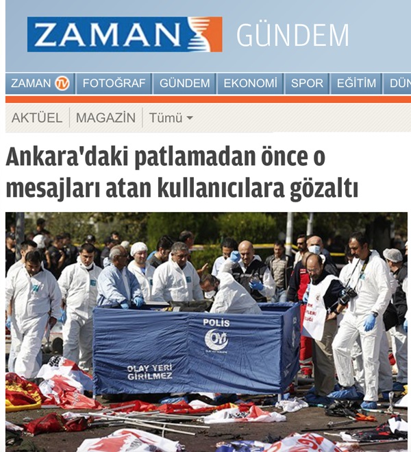 Ankara'daki hain saldırı öncesi bombanın patlayacağını haber veren Twitter hesapların kullanıcılarının PKK üyesi ve HDP aday adayı çıkmasıyla Hürriyet ve Zaman bu şahsın kimliğini gizledi. Zaman, 'Ankara'daki patlamadan önce o mesajları atan kullanıcılara gözaltı' şeklinde haberi verirken kişinin kimliğini belirtmedi Hürriyet ise haberi manşetten görmeyerek HDP'yi cici çocuk gibi göstermeye devam etti.