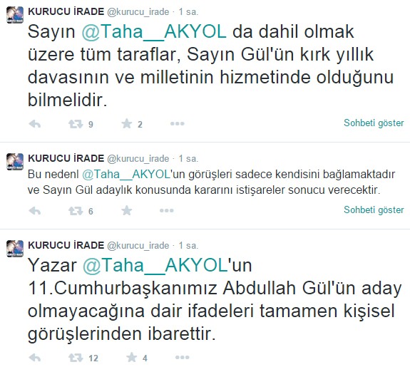 -Bu nedenl @Taha__AKYOL'un görüşleri sadece kendisini bağlamaktadır ve Sayın Gül adaylık konusunda kararını istişareler sonucu verecektir.