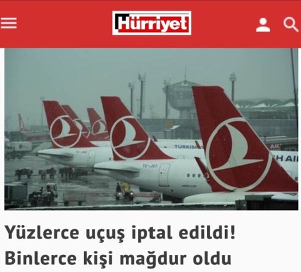 THY, yoğun kar yağışı nedeniyle bazı seferleri iptal etmek zorunda kaldı. Aydın Doğan'a bağlı Hürriyet gazetesi, günler öncesinden 'kutupsal soğuk' diye duyurduğu halde, İstanbul'a son yılların en yoğun kar yağışının gelmesine aldırmadan THY'nin sefer iptalleri üzerinden Türkiye'nin en büyük markalarından birini hedef aldı.