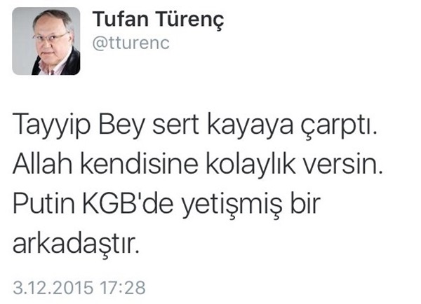 Türk hava sahasını ihlal eden Rus jetinin düşürülmesinden sonra Türkiye ile Rusya arasında ilişkiler gerildi. Yaşanan bu gerginlik konusunda tweet atan Hürriyet Gazetesi Yazı İşleri Müdürü Tufan Türenç, "Tayyip Bey sert kayaya çarptı. Allah kendisine kolaylık versin. Putin KGB'de yetişmiş bir arkadaştır" şeklinde skandal bir yorumda bulundu.