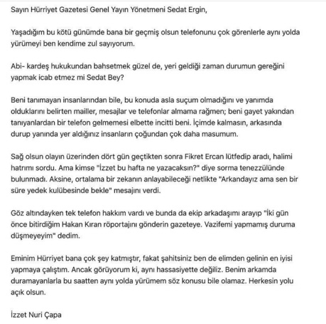 Kişisel Instagram hesabından bir açıklama yapan Çapa, "Zor zamanlarında insan dostlarını yanında görmek istiyor. Herkesin yolu açık olsun! Dün Hürriyet gazetesine istifamı sundum" dedi.