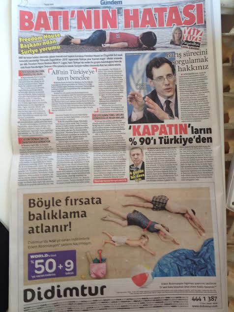 Büyük bir felaket sonucu hayatını kaybeden Suriyeli göçmen Aylan bebek talihsiz bir olaya konu oldu. Hürriyet gazetesi Aylan bebeğin fotoğrafını kullandığı sayfa manşetinin altına koyduğu böyle fırsata balıklama atlanır reklamı tepki çekti.
