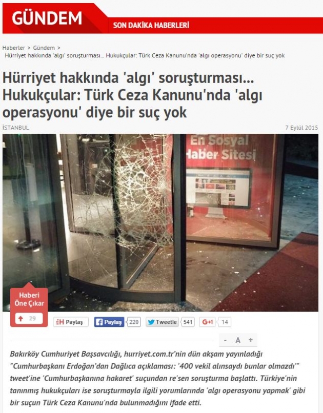 Türkiye'nin hemen her kesiminden vatandaşın tepkisini çeken Hürriyet, algı operasyonu yaptığını adeta kabul edercesine yayınladığı haberde; "Bakırköy Cumhuriyet Başsavcılığı, hurriyet.com.tr’nin dün akşam yayınladığı "Cumhurbaşkanı Erdoğan’dan Dağlıca açıklaması: '400 vekil alınsaydı bunlar olmazdı'" tweet'ine 'Cumhurbaşkanına hakaret' suçundan re'sen soruşturma başlattı. Türkiye'nin tanınmış hukukçuları ise soruşturmayla ilgili yorumlarında 'algı operasyonu yapmak' gibi bir suçun Türk Ceza Kanunu'nda bulunmadığını ifade etti" şeklinde ifadeler kullandı.
