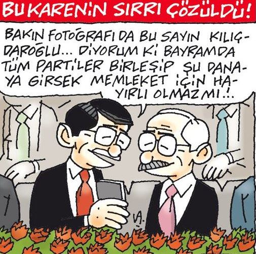 Hürriyet, 30 Ağustos Zafer Bayramı kutlamaları kapsamında Atatürk Kültür Merkezi'nde düzenlenen tören esnasında Başbakan Davutoğlu ile CHP lideri Kılıçdaroğlu arasında geçen diyalog sonrası çirkin bir karikatür yayınladı. Davutoğlu'nun Kılıçdaroğlu'na telefondan torununun fotoğrafını gösterdiği kare ile alay eden Hürriyet, karikatürüyle hakaret etti.