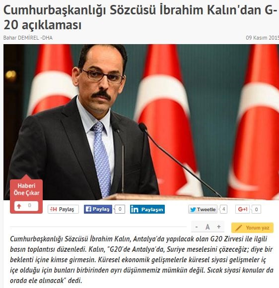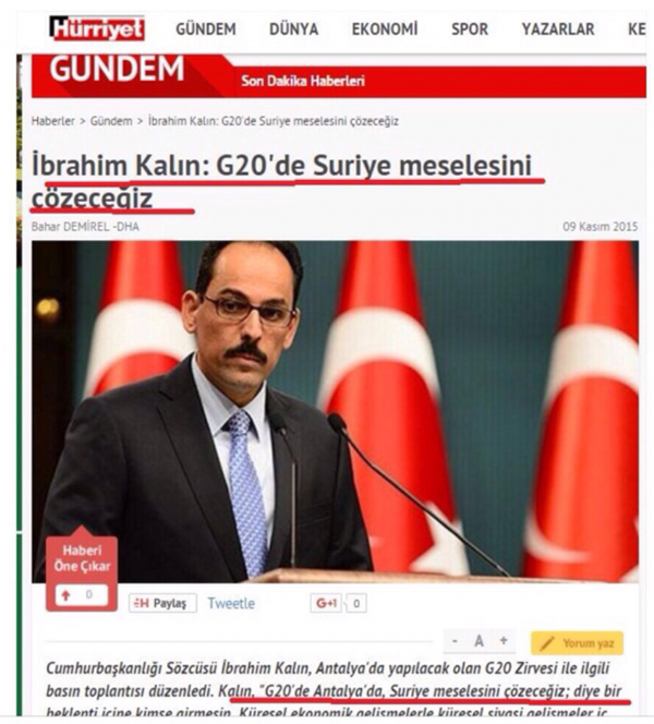 Hürriyet Gazetesi, Kalın'ın 'G20'de Suriye meselesini çözeceğiz diye bir beklenti içine kimse girmesin'' sözlerini 'G20'de Suriye meselesini çözeceğiz' başlığıyla okuyucularına aktarınca trajikomik bir görüntü ortaya çıktı. Hürriyet'in bu çarpıtma haberi kendi okuyucuları da dahil sosyal medyada tepkiye neden oldu.