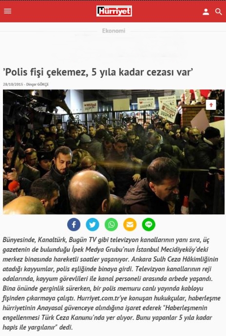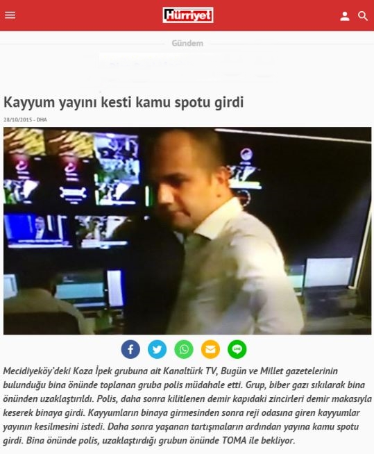 İpek Holding önünde toplanan grubun, kayyumun girişini engellemeye çalışmasını görmezden gelen gazete, haberi "Bina önünde bulunan gruba polis müdahalesi" diye verdi. Ayrıca kayyumların yayını kestiğini iddia eden Hürriyet, bunun üzerine ekranda kamu spotu geçtiğini aktardı.