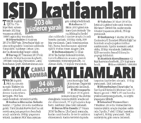 “Benim teröristim daha iyi” demeye mi getiriyorsunuz? Tek haberde ikisini de verirsin, “Şu kadar zamanda şu kadar olay oldu, şu kadar insan öldü” dersin, anlarız... DAEŞ ile PKK’yı kıyaslamak nereden çıkıyor Hürriyet? Üstelik, 30 yılda 30 bin kişiyi öldüren PKK’ya sadece 94 kişiyi öldürmüş muamelesi yapmaya utanmıyor musunuz? Böyle böyle milletin aklıyla alay ediyorsunuz da, bu millet artık yemiyor... Ahter Kudadgu’ya bin kere açıklama yayınlatsan “Bizi terörist destekçisi göstermek iftiradır” diye, bu yandaki rezilliği gören kimseyi inandıramazsın...