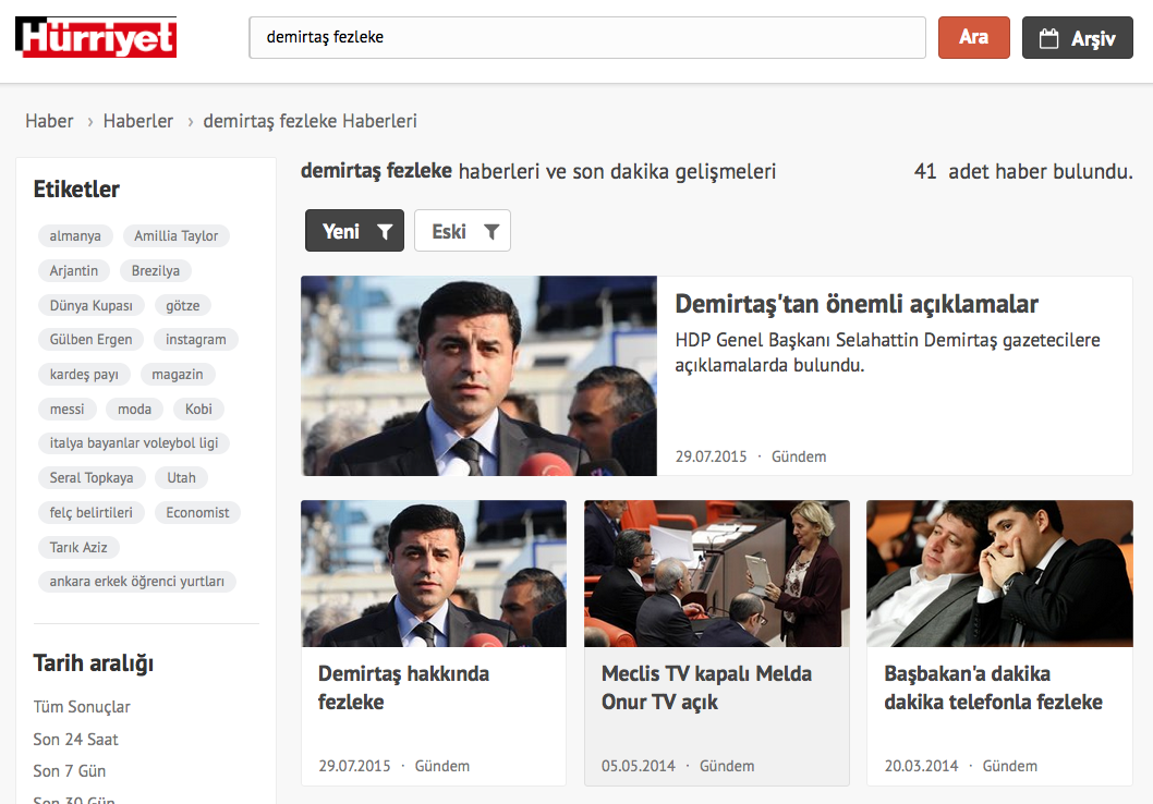 İşte Hürriyet internet sitesinde arşiv bölümünde yapılan arama ile çıkan sonuç. "Demirtaş" ve "Fezleke" kelimeleri ile yapılan aramada, "Demirtaş Hakkında Fezleke" başlığı ile haber 29 Temmuz tarihinde kullanılmış görünüyor.
