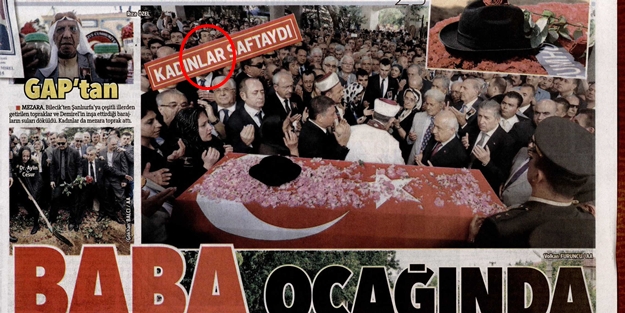 Hürriyet şimdi de Süleyman Demirel'in Isparta'daki cenaze töreni için kullandığı fotoğrafta aynı şeyi yaptı. Demirel'in cenaze töreninde naaşın başıda cenaze namazının fotoğrafını kullanan gazete Süleyman Soylu'nun olduğu yere bir bant çekerek Kadınlar Saftaydı yazısını yerleştirdi.