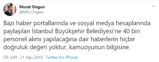 “Bazı haber portallarında ve sosyal medya hesaplarında paylaşılan İstanbul Büyükşehir Belediyesi'ne 40 bin personel alımı yapılacağına dair haberlerin hiçbir doğruluk değeri yoktur, kamuoyunun bilgisine.”