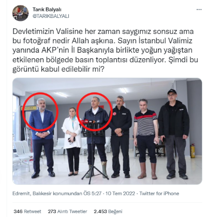 Devletimizin Valisine her zaman saygımız sonsuz ama bu fotoğraf nedir Allah aşkına? Sayın İstanbul Valimiz yanında AKP'nin İl Başkanıyla birlikte yoğun yağıştan etkilenen bölgede basın toplantısı düzenliyor. Şimdi bu görüntü kabul edilebilir mi?
