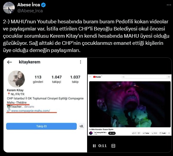 Öte yandan sosyal medya sayfası Abese İrca, konuya ilişkin paylaşımında, MAHU'nun Youtube hesabında buram buram Pedofili kokan videolar ve paylaşımlar olduğunu ortaya koydu. “İstifa ettirilen CHP'li Beyoğlu Belediyesi okul öncesi çocuklar sorumlusu Kerem Kitay'ın kendi hesabında MAHU üyesi olduğu gözüküyor. Sağ alttaki de CHP'nin çocuklarımızı emanet ettiği kişilerin üye olduğu derneğin paylaşımları” ifadeleriyle sapkın paylaşımları ifşa etti.