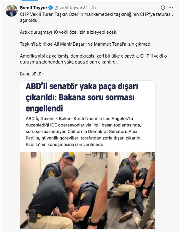 Eski AK Parti milletvekili Şamil Tayyar da karar üzerine sosyal medya hesabından dikkat çeken bir paylaşım yaptı. Tayyar, paylaşımında şu ifadeleri kullandı: CHP Vekili Turan Taşkın Özer’in mahkemedeki taşkınlığının CHP’ye faturası, ağır oldu. Artık duruşmayı 10 vekil özel izinle izleyebilecek. Taşkın’la birlikte Ali Mahir Başarır ve Mahmut Tanal’a izin çıkmadı. Amerika gibi az gelişmiş, demokrasisi geri bir ülke olsaydık, CHP’li vekil o duruşma salonundan yaka paça dışarı çıkarılırdı. Buna şükür.