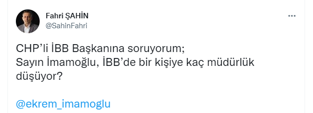 AK Parti İstanbul İl Başkan Yardımcısı Fahri Şahin, CHP'li Ekrem İmamoğlu yönetimindeki İBB'nin 3 şubesine müdür olarak atanan Sinan Gündüz üzerinden İmamoğlu'na, "İBB’de bir kişiye kaç müdürlük düşüyor?" diye sordu.
