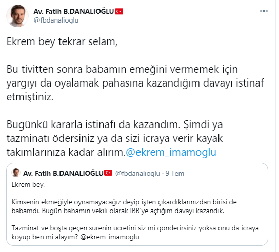 Danalıoğlu yaptığı paylaşımda, “Ekrem bey tekrar selam, Bu tivitten sonra babamın emeğini vermemek için yargıyı da oyalamak pahasına kazandığım davayı istinaf etmiştiniz. Bugünkü kararla istinafı da kazandım. Şimdi ya tazminatı ödersiniz ya da sizi icraya verir kayak takımlarınıza kadar alırım.” ifadelerini kullandı.