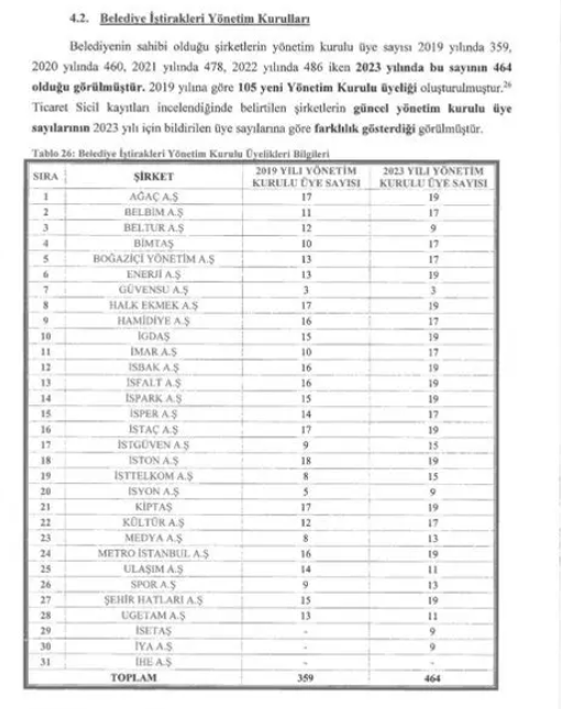 İBB Haber sosyal medya hesabının ortaya çıkardığı raporda, “İsrafı bitirdik, hizmeti getirdik” sloganıyla seçim propagandası yapan CHP’li İstanbul Büyükşehir Belediye Başkanı Ekrem İmamoğlu’nun belediye iştiraklerine 105 kişiyi fazladan yönetim kuruluna yerleştirdiği öğrenildi. 2019 yılında 359 yönetim kurulu üyesi varken 2023 yılında bu sayı 464'e yükseldi.