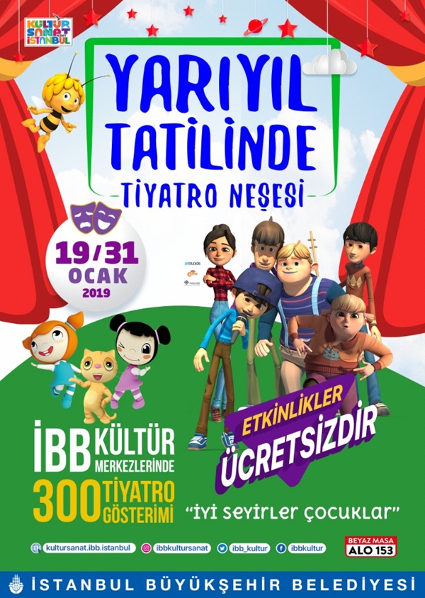 İstanbul Büyükşehir Belediyesi Kültür Daire Başkanlığı, çocuklara karne hediyesi olarak “Yarıyıl Tatilinde Tiyatro Neşesi” projesini hayata geçiriyor. Proje kapsamında İstanbul genelinde müzikal, komedi ve kukla türlerinde 300 tiyatro gösterimi yapılacak. Tiyatrolarda, çocukların çok sevdiği Rafadan Tayfa, Minyonlar, Hapşuu gibi çizgi film karakterleri de yer alacak. Bununla birlikte Tuzla’daki İBB İdris Güllüce Kültür Merkezi’nde çocuklar için kukla atölyesi açılacak. Çocuklar, uzman öğretmenler eşliğinde hayal ettiği kuklayı yapma imkanı bulacak.