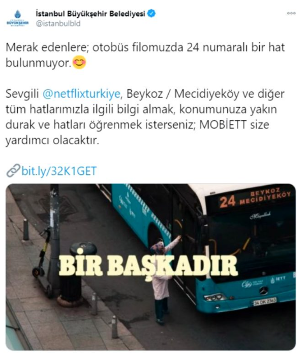 Dizide bir karakterin 24 numaralı Beykoz otobüsüne binmesine kafayı takan İBB'nin resmi sosyal medya hesabından yapılan açıklamada "Merak edenlere; otobüs filomuzda 24 numaralı bir hat bulunmuyor. Sevgili @netflixturkiye, Beykoz/ Mecidiyeköy ve diğer tüm hatlarımızla ilgili bilgi almak, konumunuza yakın durak ve hatları öğrenmek isterseniz; MOBİETT size yardımcı olacaktır" ifadelerini yer verildi.