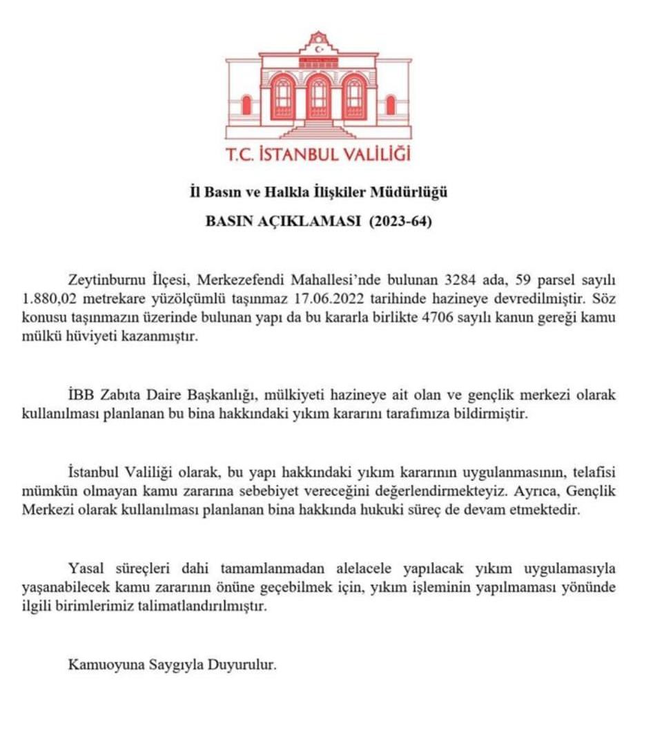 İstanbul Valiliği, CHP'li İBB'nin, Zeytinburnu'nda Gençlik Merkezi olarak kullanılması planlanan yapıp yıkma kararına dair açıklama yaptı.