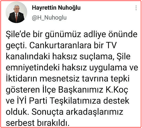 Nuhoğlu, Twitter'dan "Şile'de bir günümüz adliyede geçti. Cankurtaranlara bir TV kanalındaki haksız suçlama, Şile emniyetindeki haksız uygulama ve iktidarın mesnetsiz tavrına tepki gösteren ilçe başkanımız Kamil Koç ve İYİ Parti teşkilatımızla destek olduk. Sonuçta arkadaşlarımız serbest bırakıldı" mesajını paylaştı.